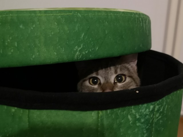 Najraje je na ramenu, tako imamo mucka in papigo. Nežen mucek fivček, posvojen iz MH lani novembra.