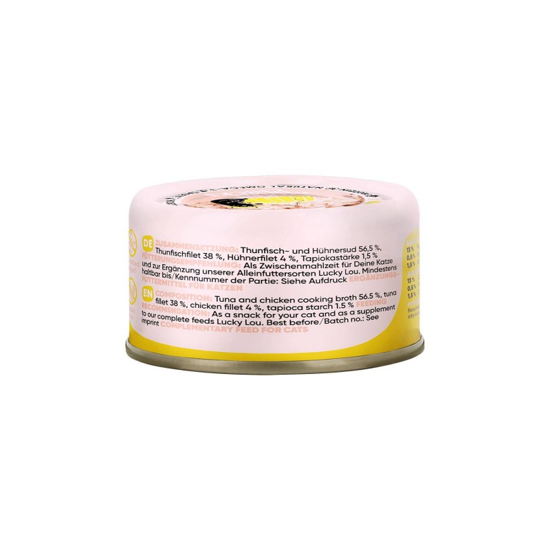 Sestavine so seveda primerne prav za mačke! Brez žitaric, brez riža, brez dodanega sladkorja – tega ne maram v svoji pločevinki. Hočem veliko mesa in rib! Predvsem ljubitelji rib boste prišli na svoj račun, saj sem tuno kombiniral s številnimi dobrotami. Na primer z lososom, kozicami ali piščančjim filejem. Zraven je tudi tuna z jabolkom ali zelenjavo. Za vsakogar se nekaj najde. In če slučajno vaša mačka ne mara rib, ji ponudite Lucky Lou Extra Food piščančji file.