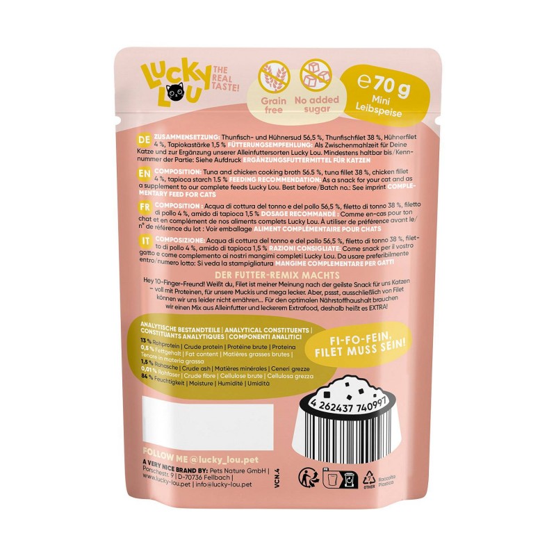 Sestavine so seveda primerne prav za mačke! Brez žitaric, brez riža, brez dodanega sladkorja – tega ne maram v svoji pločevinki. Hočem veliko mesa in rib! Predvsem ljubitelji rib boste prišli na svoj račun, saj sem tuno kombiniral s številnimi dobrotami. Na primer z lososom, kozicami ali piščančjim filejem. Zraven je tudi tuna z jabolkom ali zelenjavo. Za vsakogar se nekaj najde. In če slučajno vaša mačka ne mara rib, ji ponudite Lucky Lou Extra Food piščančji file.