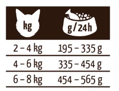 teža mačke (kg) / priporočena dnevna količina (g):