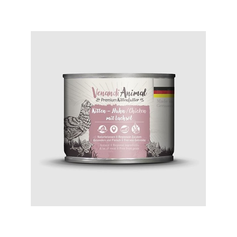 Mali lovci - velike dogodivščine. Venandi Kitten Piščanec z lososovim oljem podpira vašega mačjega mladiča pri njegovem zdravem razvoju. Čisto meso in naravno olje poskrbita, da lahko majhne tačke hitro postanejo velike in močne.
